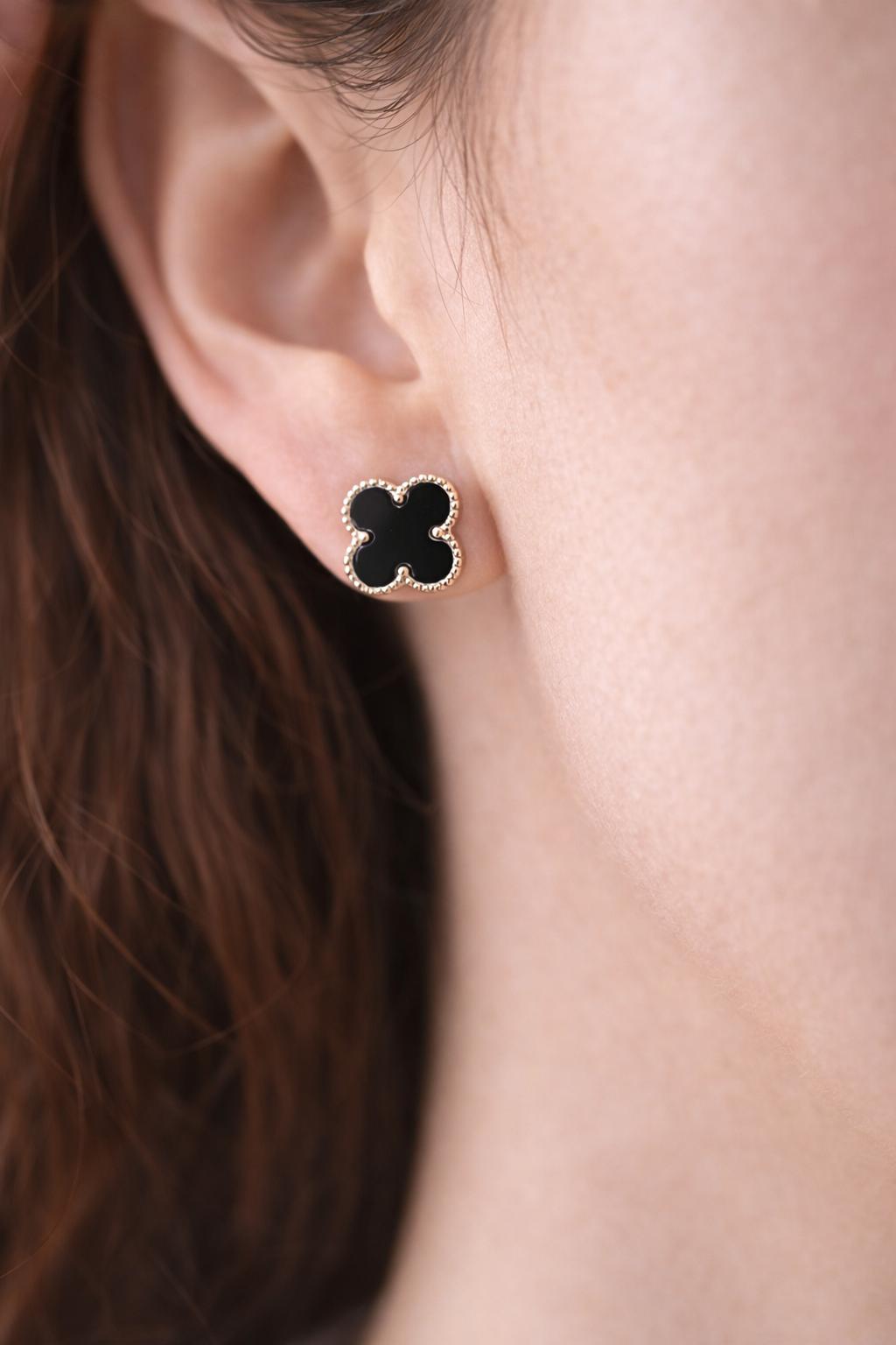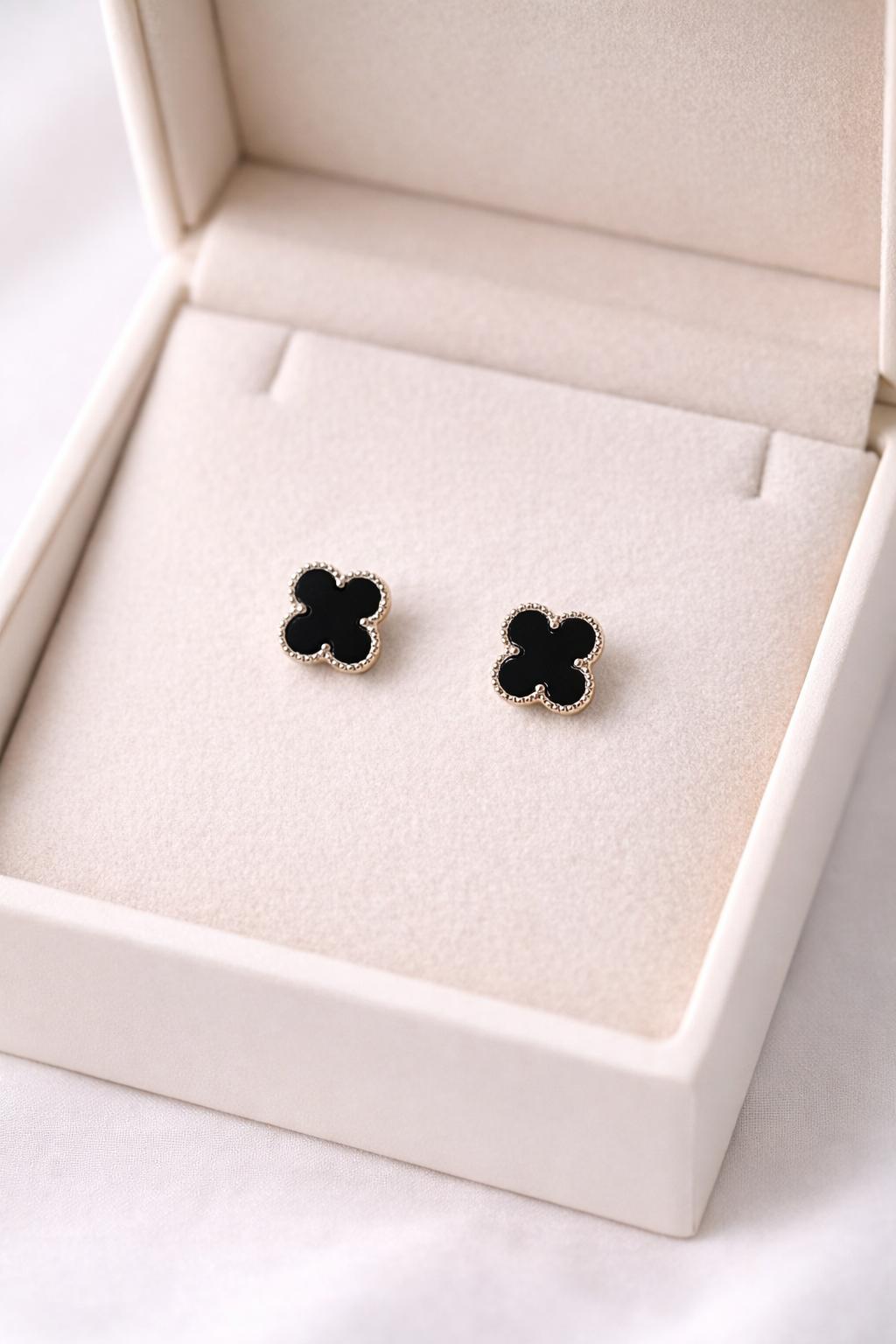 Siyah yonca figürlü çelik küpe, minimal tasarımı ve güçlü duruşuyla günlük kombinlere şıklık katar. Küçük ama dikkat çekici yapısı sayesinde hem sade hem de modern bir görünüm sunar.
