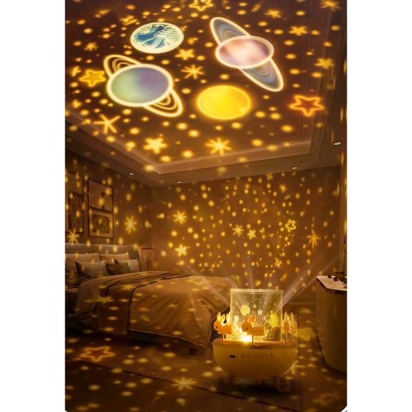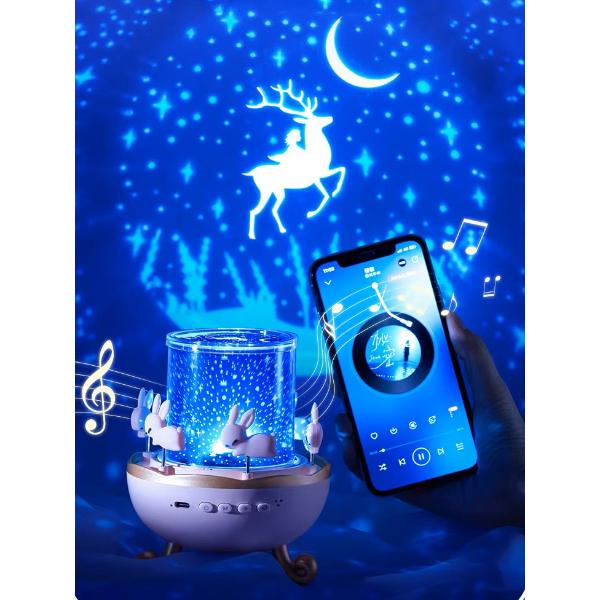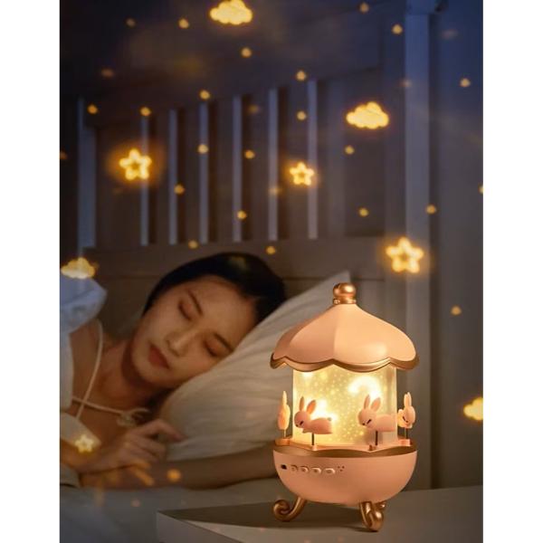 Tavşan Atlıkarınca Multifonksiyon Projektör, müzik kutusu olarak da çalışabilen ve mobil cihazlar ile Bluetooth üzerinden müzik çalabilen bir üründür. Üst kısmındaki ve içteki tavşan figürleri döner, geceyi daha eğlenceli hale getirir. Cihaz, farklı ışık seviyeleri sunarak loş, orta ve güçlü aydınlatma seçenekleriyle ortamın aydınlatmasını değiştirir. Sıcak ışık, nötr ışık ve renkli ışık seçenekleriyle atmosferin tarzını değiştirebilirsiniz. Gökyüzü desenleri ve sevimli desenler içeren 12 farklı projeksiyon film diski sayesinde duvar ve tavana yıldızlar veya çeşitli desenler yansıtılabilir. USB ile şarj edilebilen bu projektör, bebek/çocuk odalarında kullanılabileceği gibi, gece lambası, uyku yardımcısı ya da hediye olarak da tercih edilebilir.