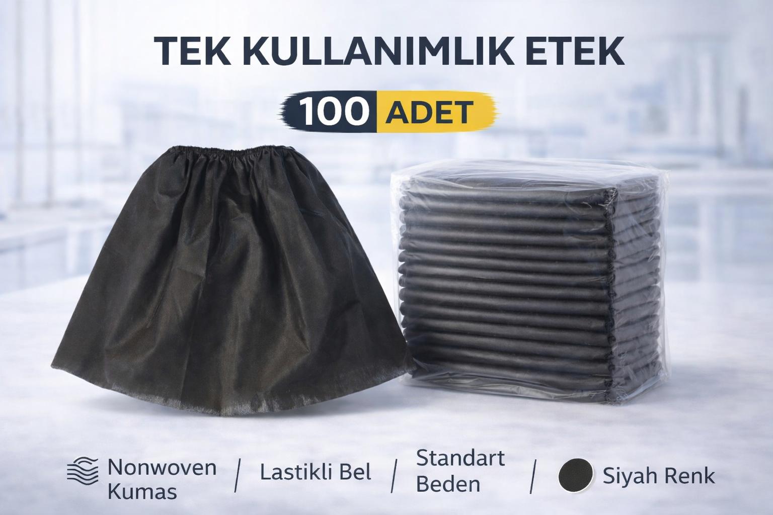 Tek kullanımlık etek 100 adet paket halinde sunulmaktadır. Hijyen gerektiren ortamlarda güvenli ve pratik kullanım sağlamak amacıyla üretilmiştir. Nonwoven kumaş yapısı sayesinde hafif, hava geçirgen ve konforlu bir kullanım sunar.