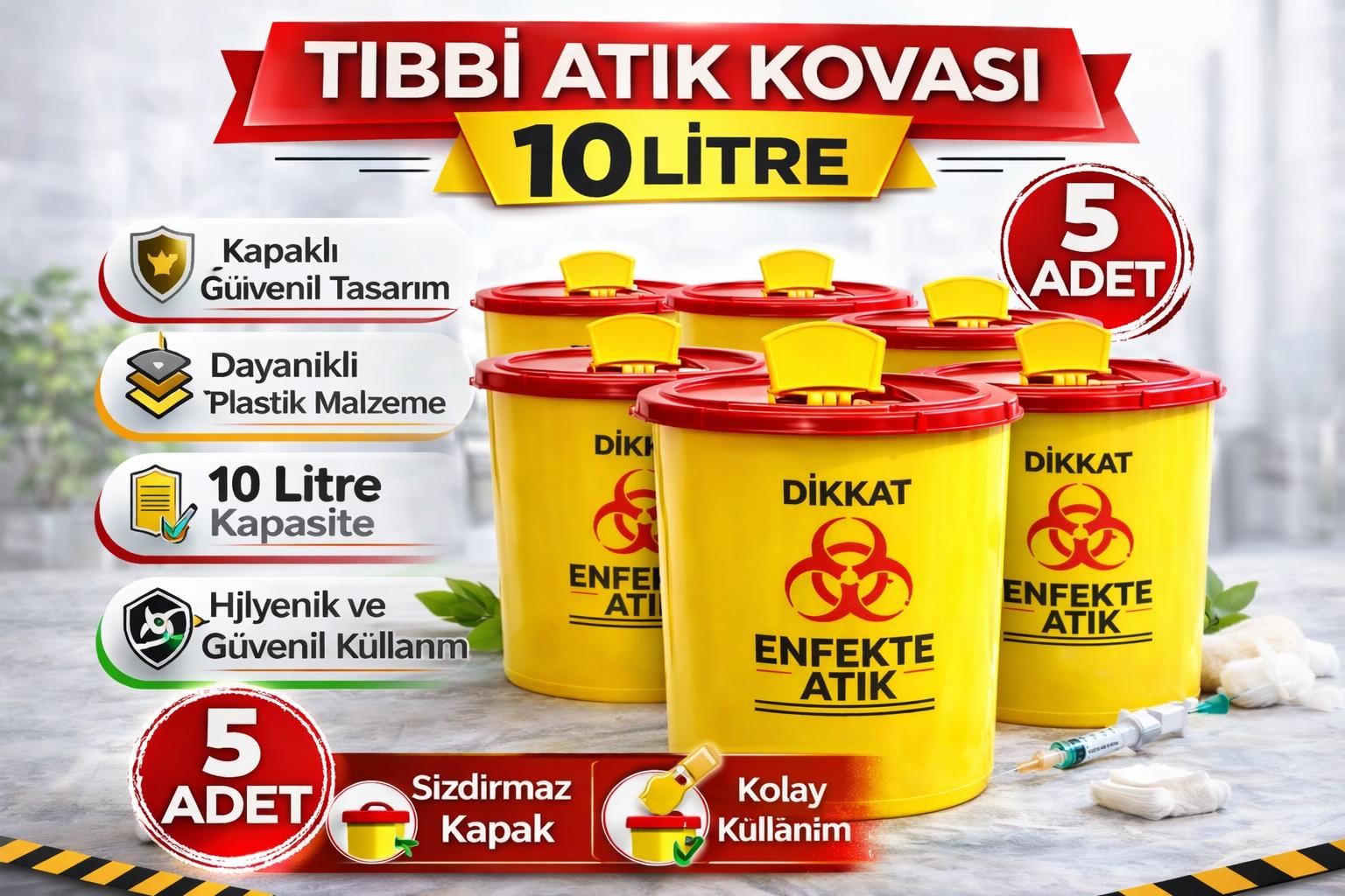 Tıbbi Atık Kovası 10 Litre 5 Adet Kapaklı Tıbbi Atık Kutusu Enfekte Atık Kovası Seti