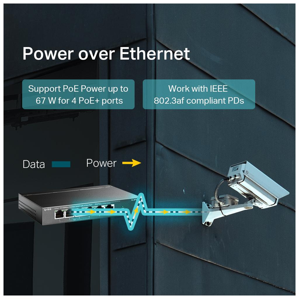 Arabirim• 6× 10/100 Mbps RJ45 Ports (ports 1–4 support 802.3af/at PoE+)