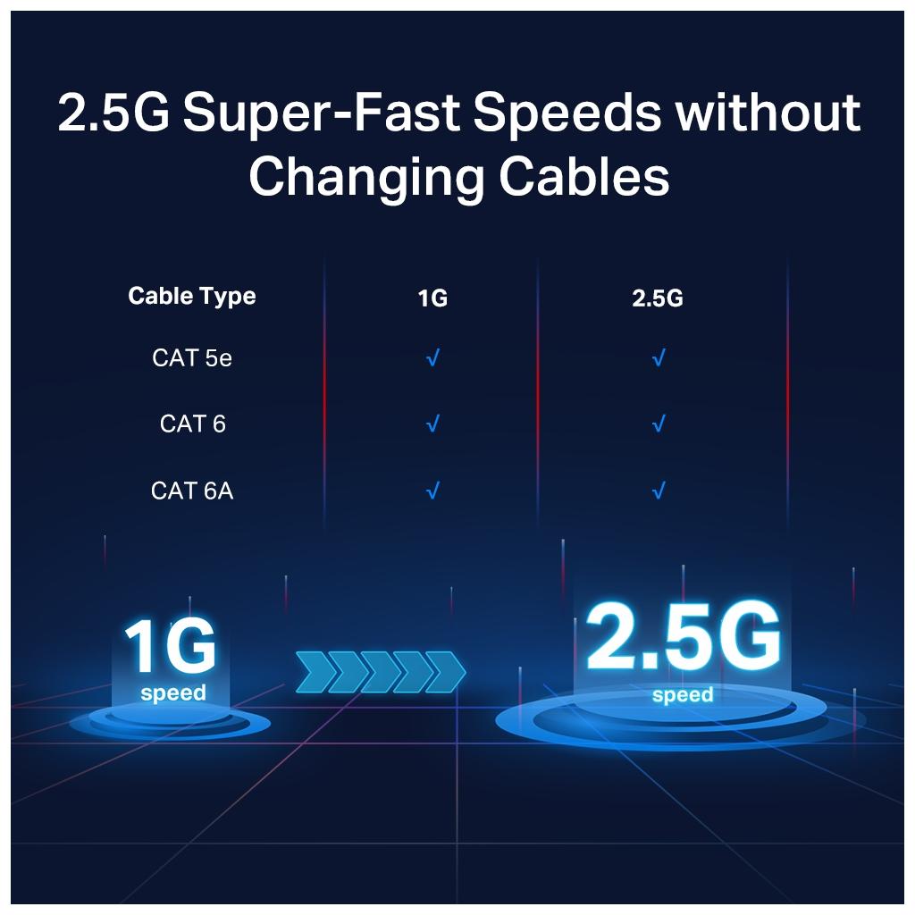 - Kolay ve Zahmetsiz Kablo Bağlantısı: Cat 6 kabloya yükseltme ihtiyacı olmaksızın anında 2.5 Gbps'ye yükseltir, kablo maliyetleri ve karmaşasını azaltır.