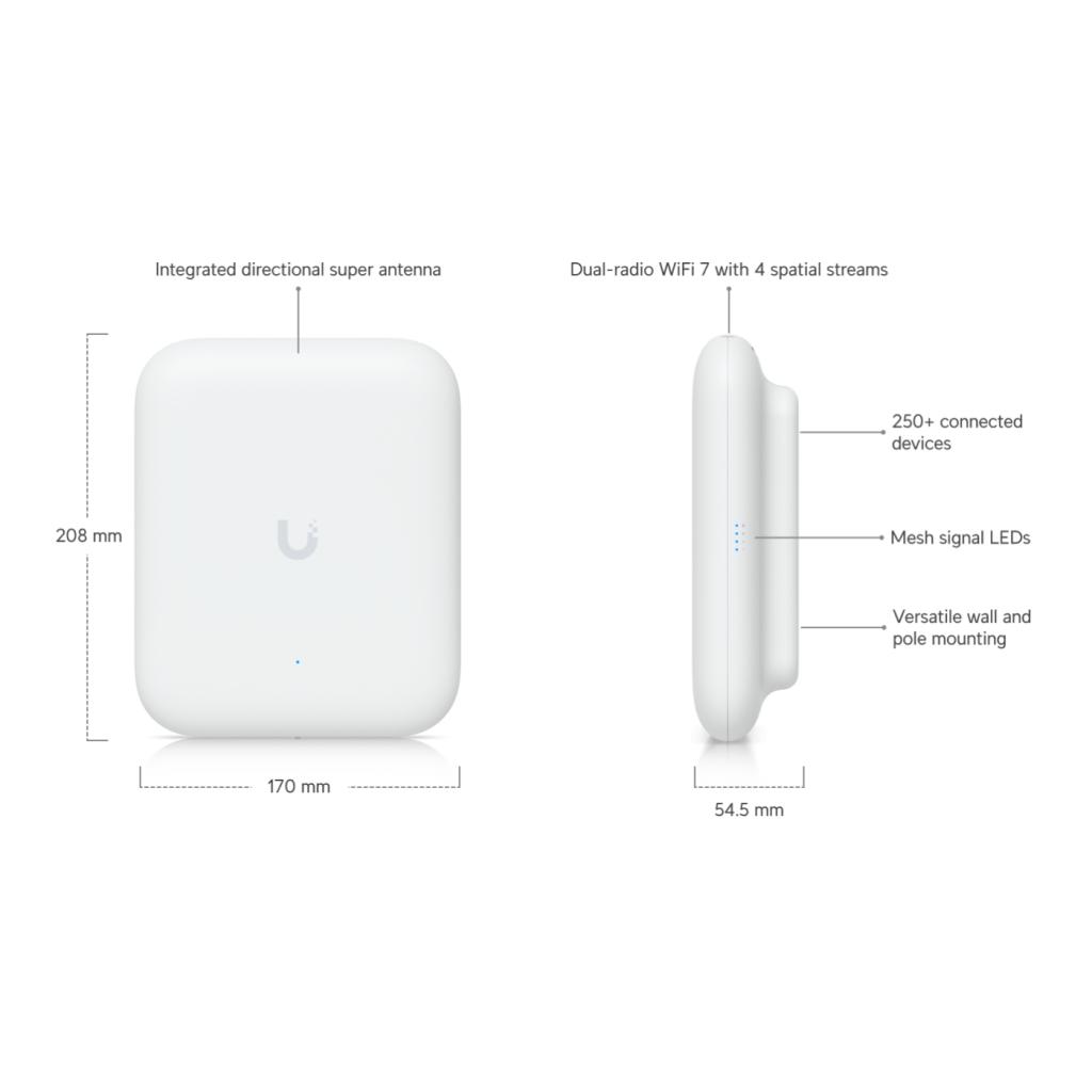 U7 Pro Outdoor, en yeni WiFi 7 (802.11be) teknolojisini dış mekân kullanımına taşıyan, yüksek performanslı ve dayanıklı bir access point’tir. Geniş kapsama alanı, düşük gecikme süresi ve yüksek kullanıcı kapasitesi sayesinde site, kampüs, otel, kafe ve açık alan projeleri için ideal bir kablosuz ağ çözümü sunar. Zorlu hava koşullarına dayanıklı yapısı ve merkezi yönetim desteğiyle profesyonel ağ ihtiyaçlarını karşılar.
