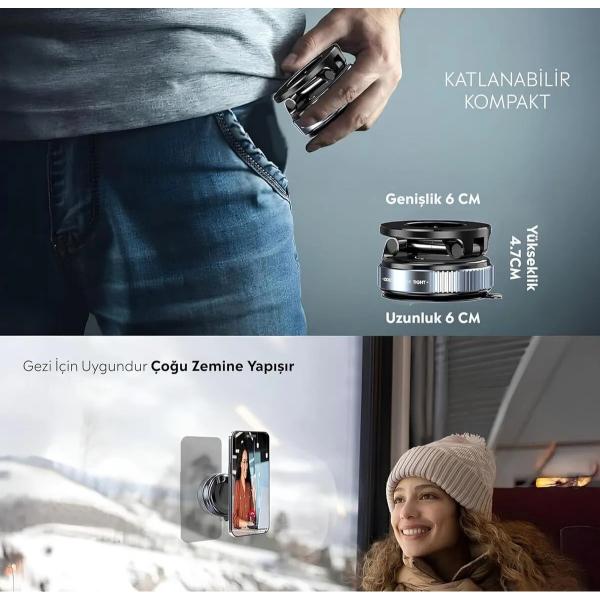 Manyetik tabanlı ve katlanabilir tasarımıyla öne çıkan bu vakumlu araç içi telefon tutucu, özellikle MagSafe uyumlu telefonlar için ideal bir çözümdür. Güçlü mıknatısları sayesinde telefonu sabit ve güvenli şekilde tutarken, hem dikey hem yatay kullanım imkânı sunar. Alt kısmındaki güçlü vakum sistemi sayesinde cam, torpido veya pürüzsüz yüzeylere sağlamca sabitlenir. Döner başlıklı ve katlanabilir yapısıyla kullanılmadığında minimum yer kaplar. Sağlam gövde yapısı ve titreşim azaltıcı özellikleriyle araç sürüş güvenliğini destekler. Sadece araçta değil, masaüstü stand olarak da pratik şekilde kullanılabilir. Modern ve şık tasarımıyla hem işlevsel hem estetik bir kullanım sunar.