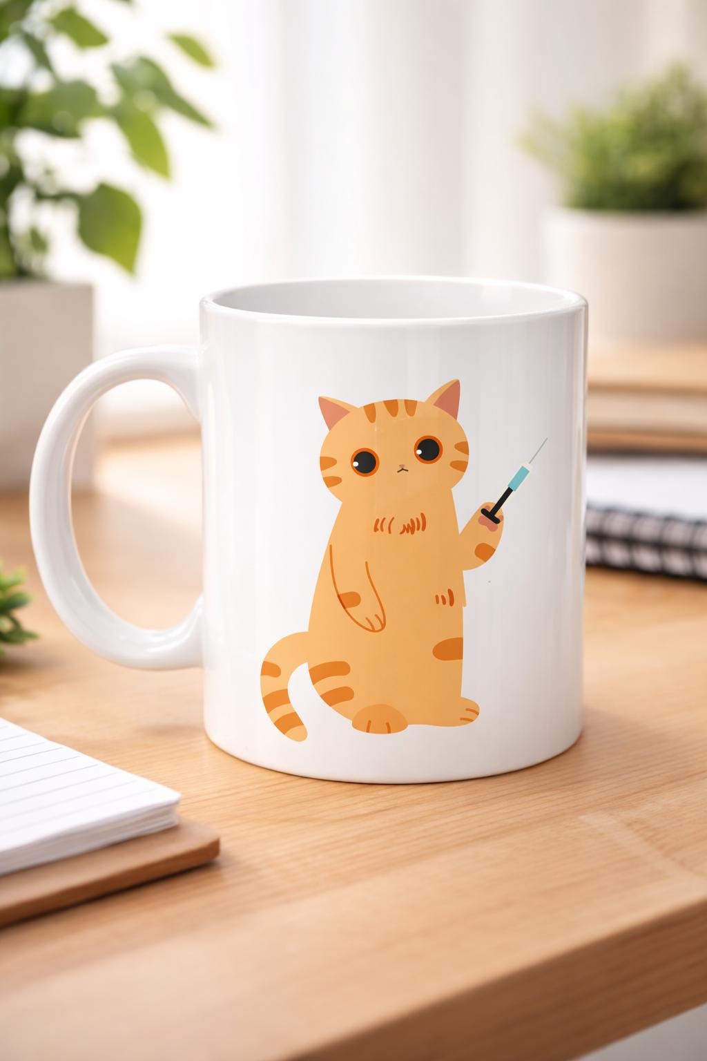 Bu özel tasarım kupanın üzerinde yer alan minik turuncu kedi karakteri, elindeki şırınga ile adeta küçük bir veteriner gibi görünüyor. Sevimli bakışlarıyla hem sağlık çalışanlarını hem de hayvan dostlarını temsil eden bu karakter, bulunduğu ortama neşe ve sıcaklık katıyor.