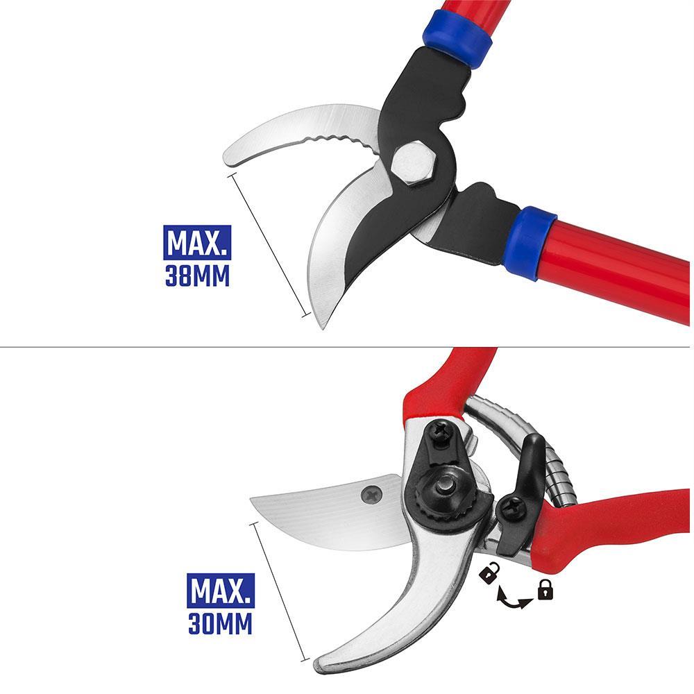 • Maksimum 200mm ve 380mm iki ayrı budama makasından oluşan S50C Yüksek dayanımlı karbon alaşımlı paslanmaz çelik bıçaklardan oluşan 2 parça setten oluşmaktadır.