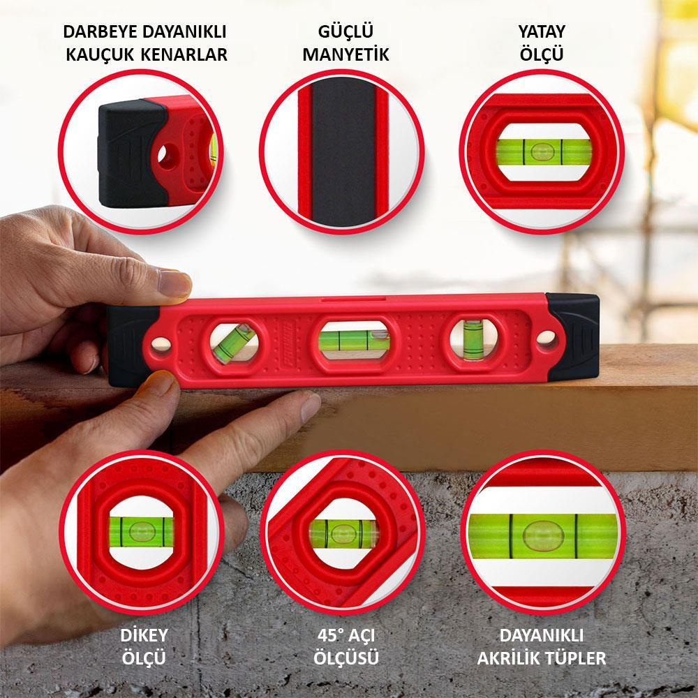 • 22,5cm manyetik yüzeyi sayesinde metal yüzeylerde, dar alanlarda, tablo asma işlerinde, raf montajlarında ve fabrika makina kurulumlarında kolay ve rahat kullanım sağlar.