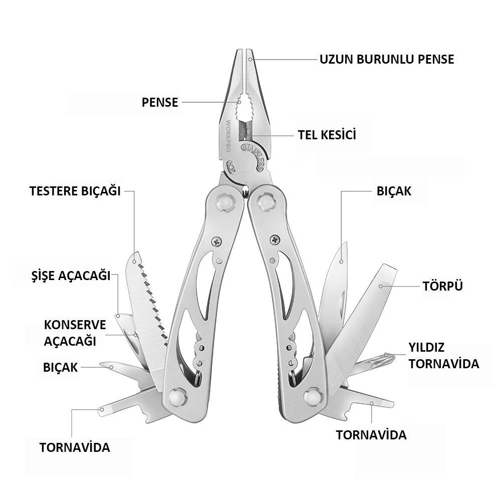 • Pense, Bıçak, Mini Çakı, Eğe, Tornavida, Mini Testere, Gazoz/Konserve Açacağı gibi birçok kullanım alanı sayesinde tek bir alet ile 12 farklı kullanım sağlar.