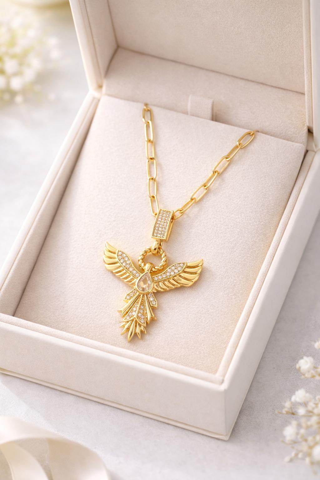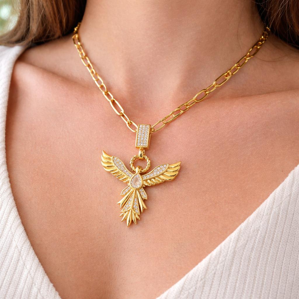 Gücün, yeniden doğuşun ve özgürlüğün sembolü Anka Kuşu figürüyle tasarlanan bu gold renk ataç zincirli çelik kolye, iddialı ve modern stilin öne çıkan tamamlayıcısıdır. Işıltılı zirkon taş detayları sayesinde boyunda dikkat çekici ve premium bir duruş sunar.