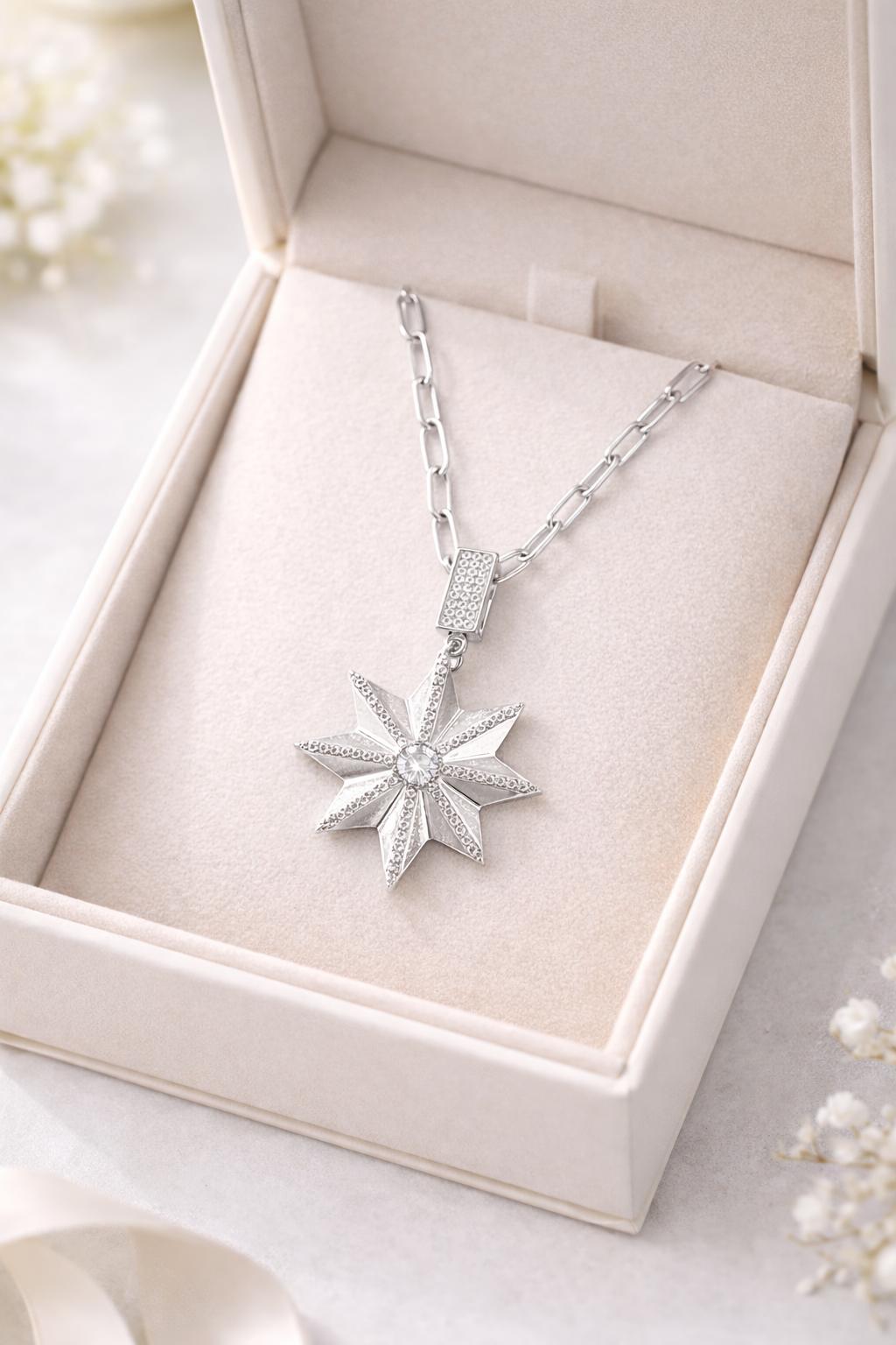 Işıltısı ve güçlü formuyla öne çıkan yıldız figürlü ataç zincir çelik kolye, modern ve iddialı stilin tamamlayıcısıdır. Göz alıcı zirkon taş detayları sayesinde boyunda dikkat çeken, sade ama etkileyici bir görünüm sunar.